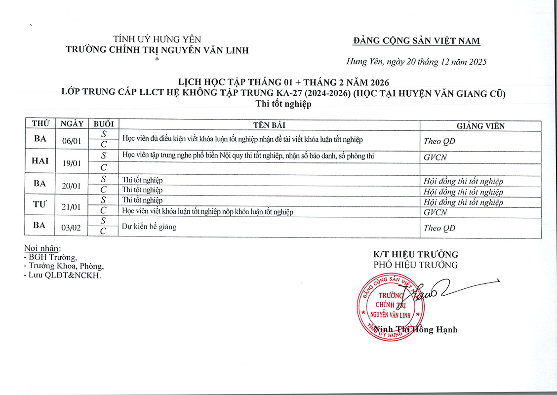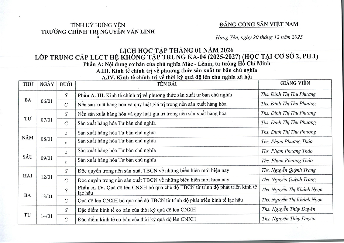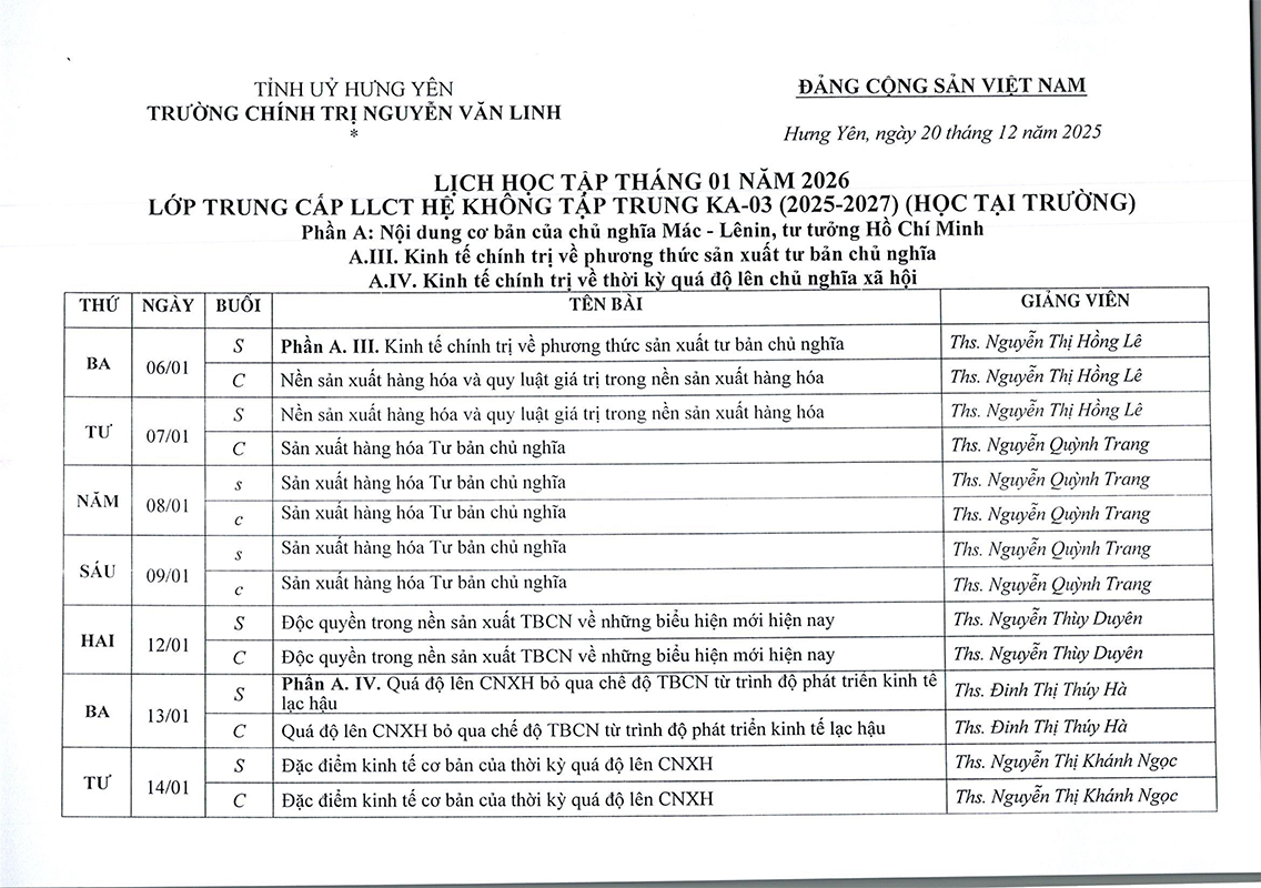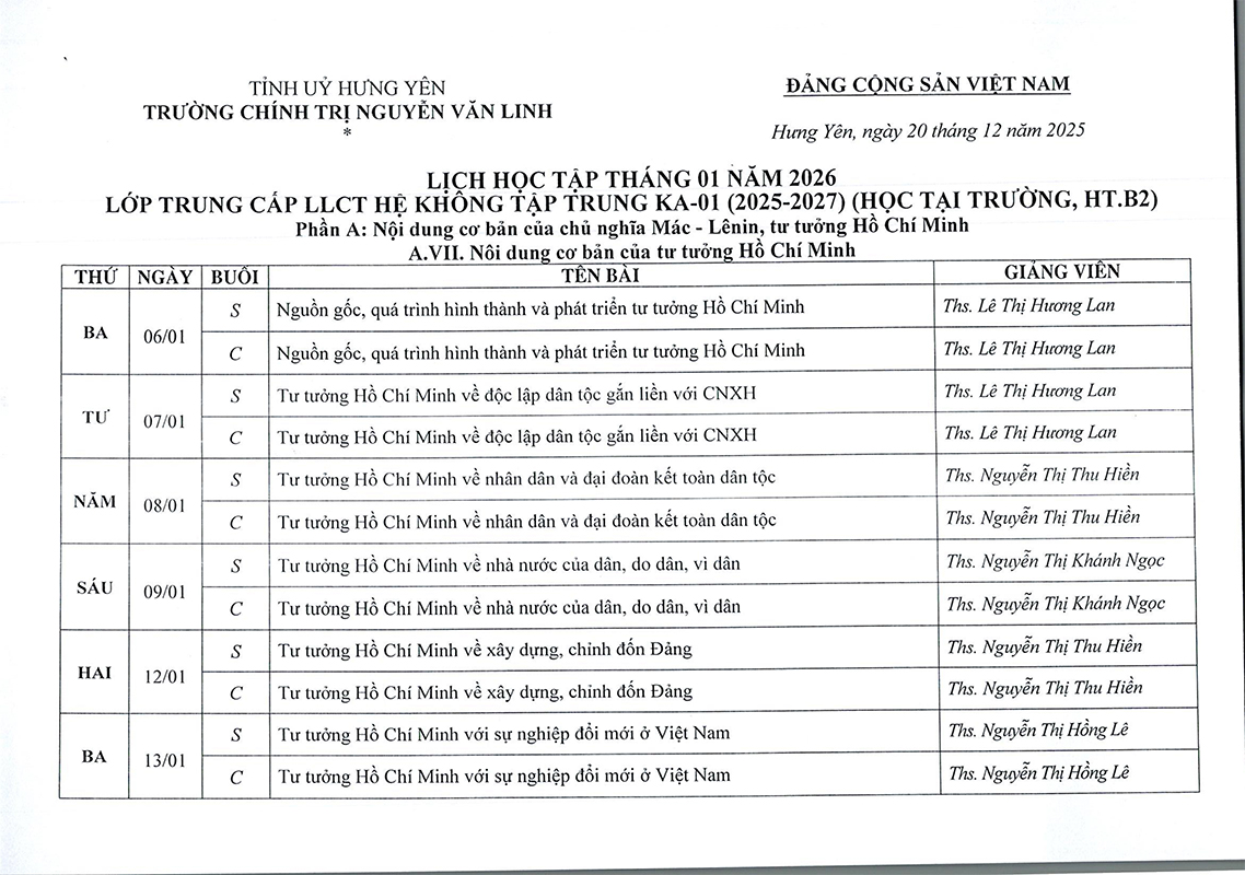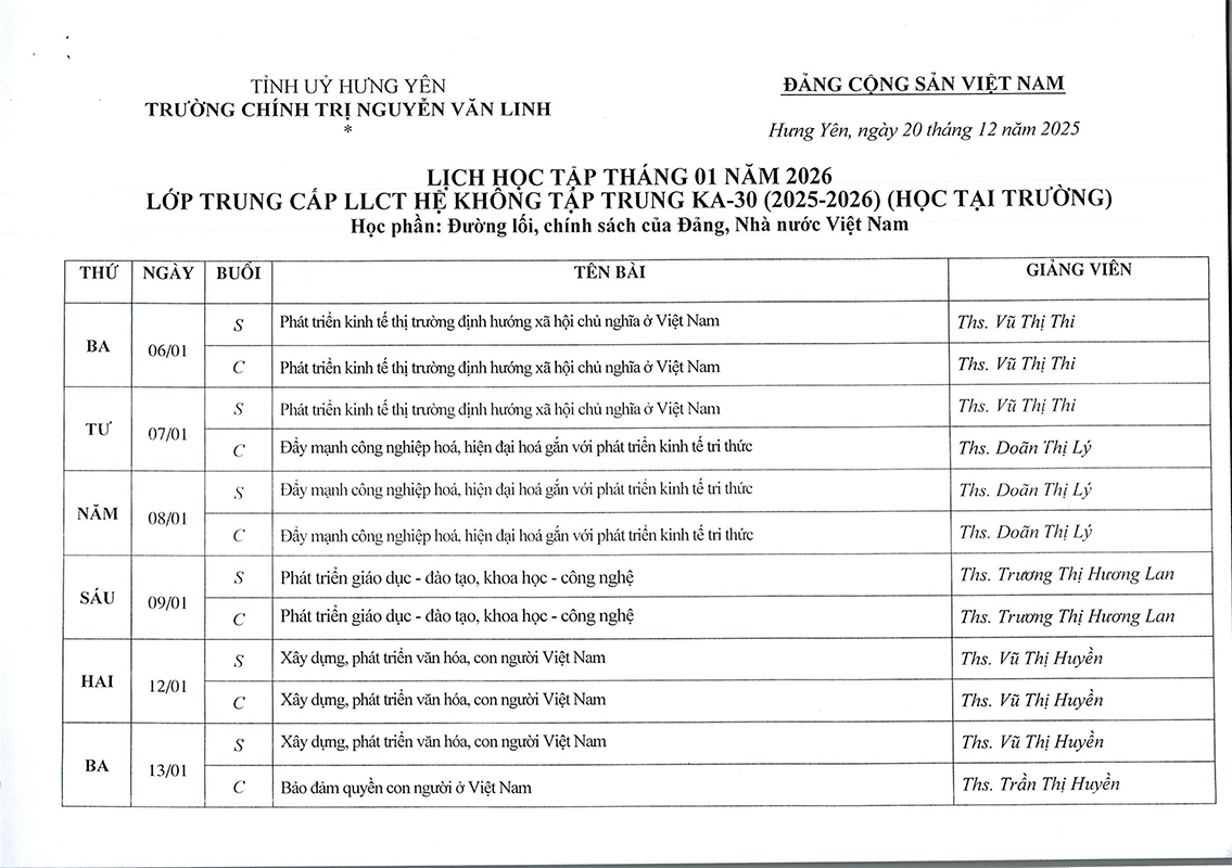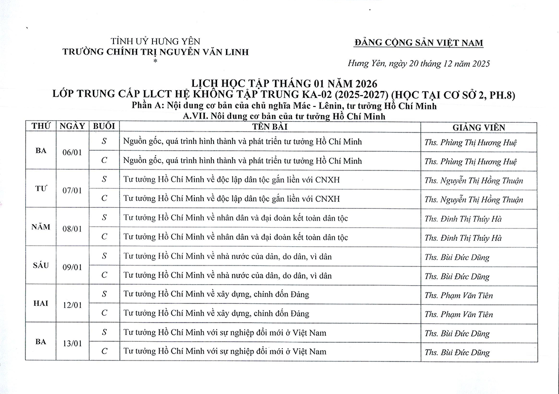 Lịch học tập tháng 01 năm 2026 các lớp TCLLCT