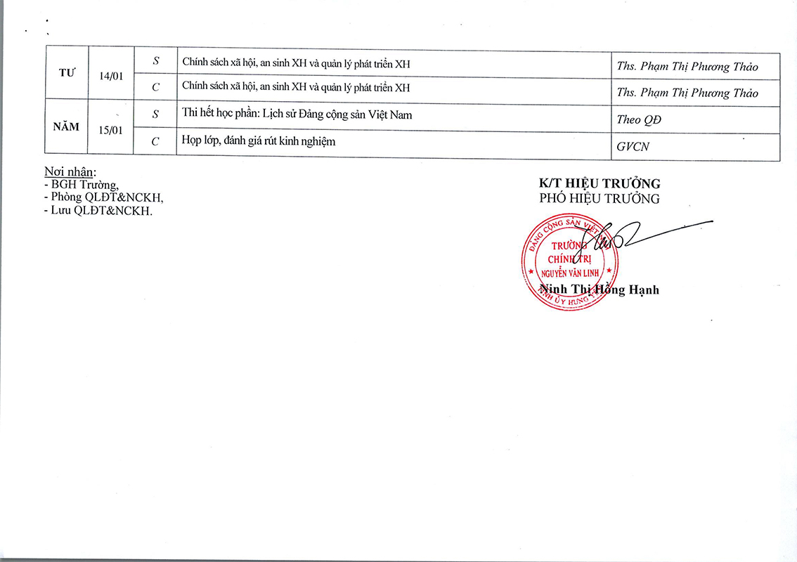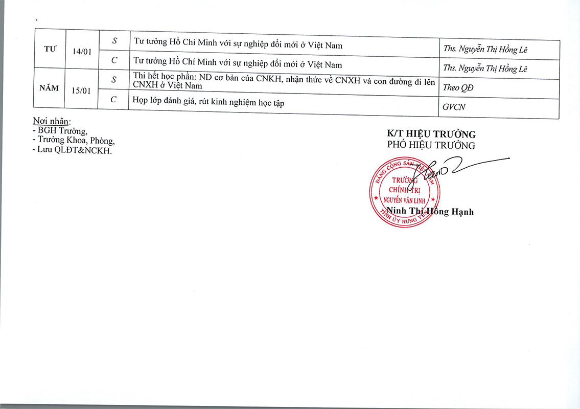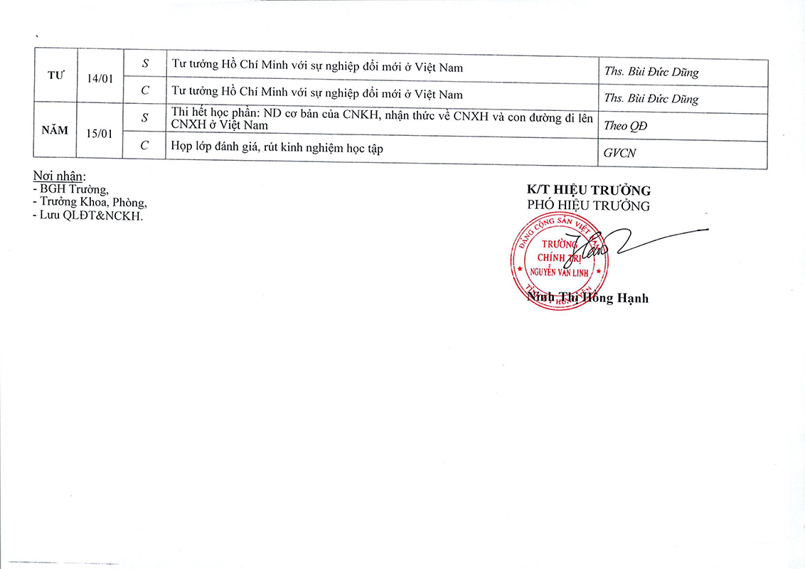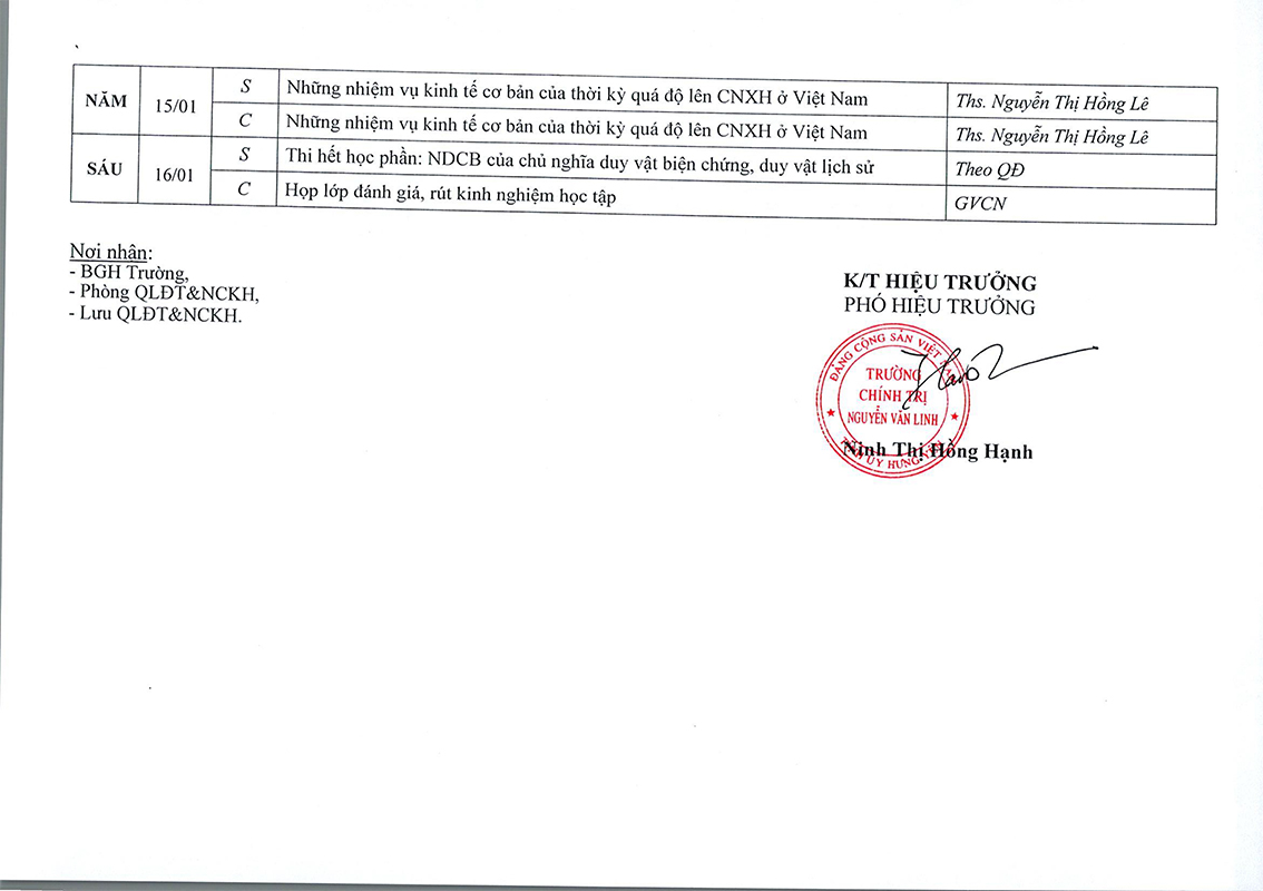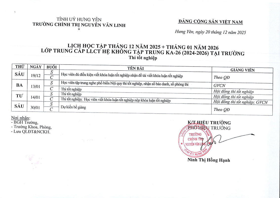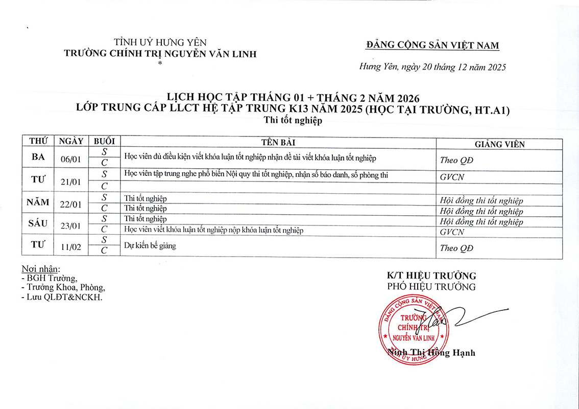 Lịch học tập tháng 01 năm 2026 các lớp TCLLCT