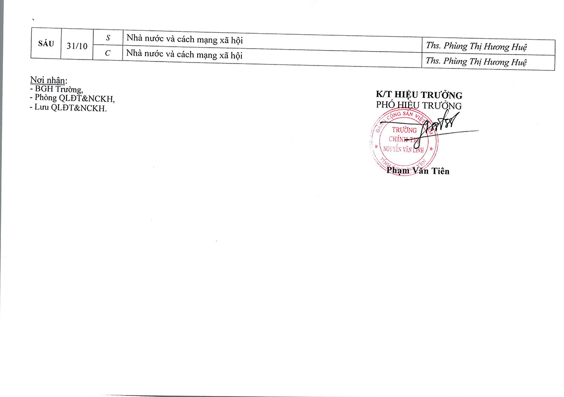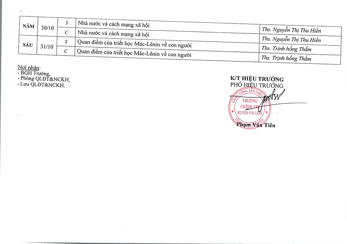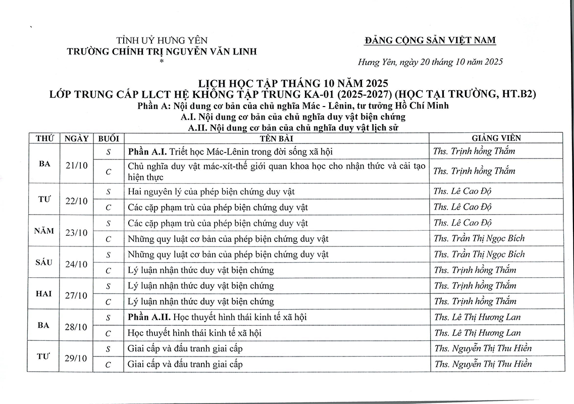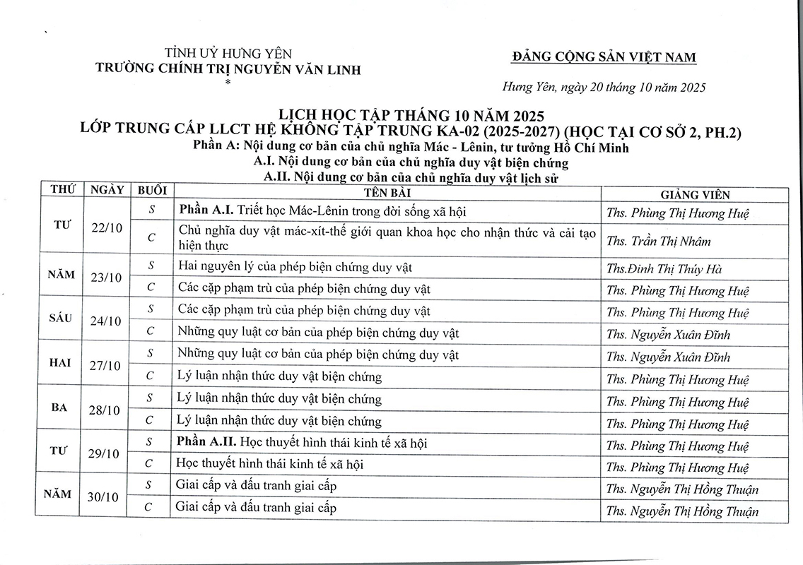 Lịch học tập tháng 10 các lớp TCLLCT (Cơ sở 1)