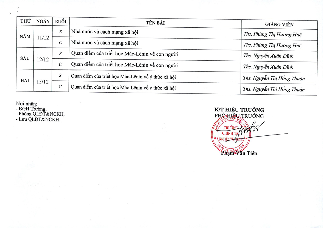 Lịch học tập tháng 12 năm 2025 các lớp TCLLCT