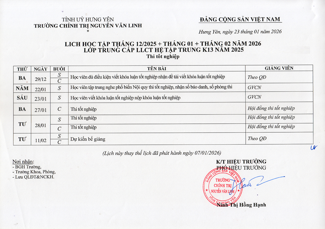 Lịch học tập tháng 01 năm 2026 các lớp TCLLCT