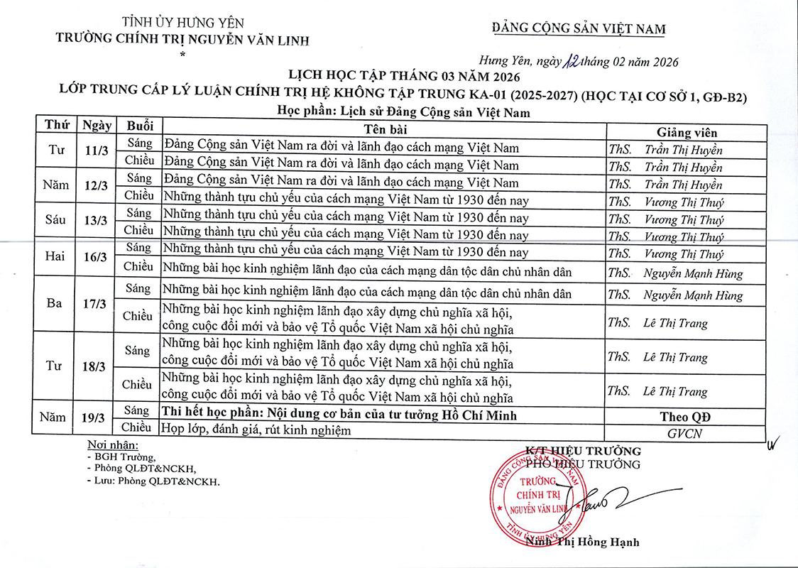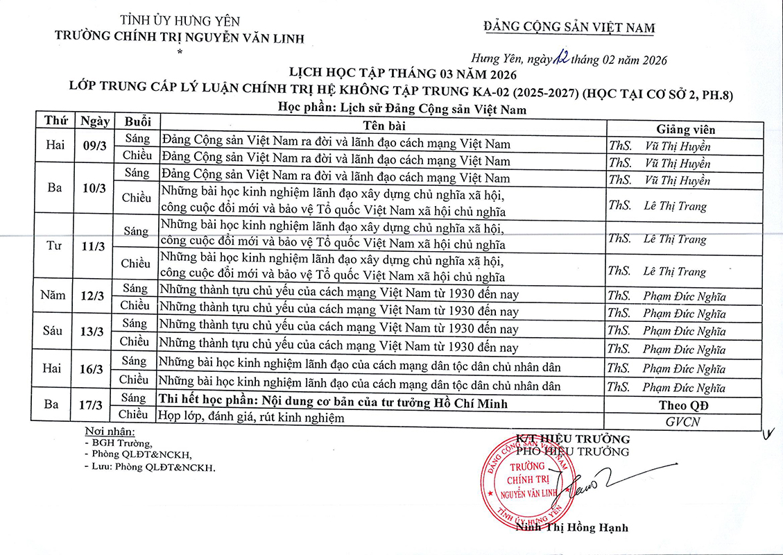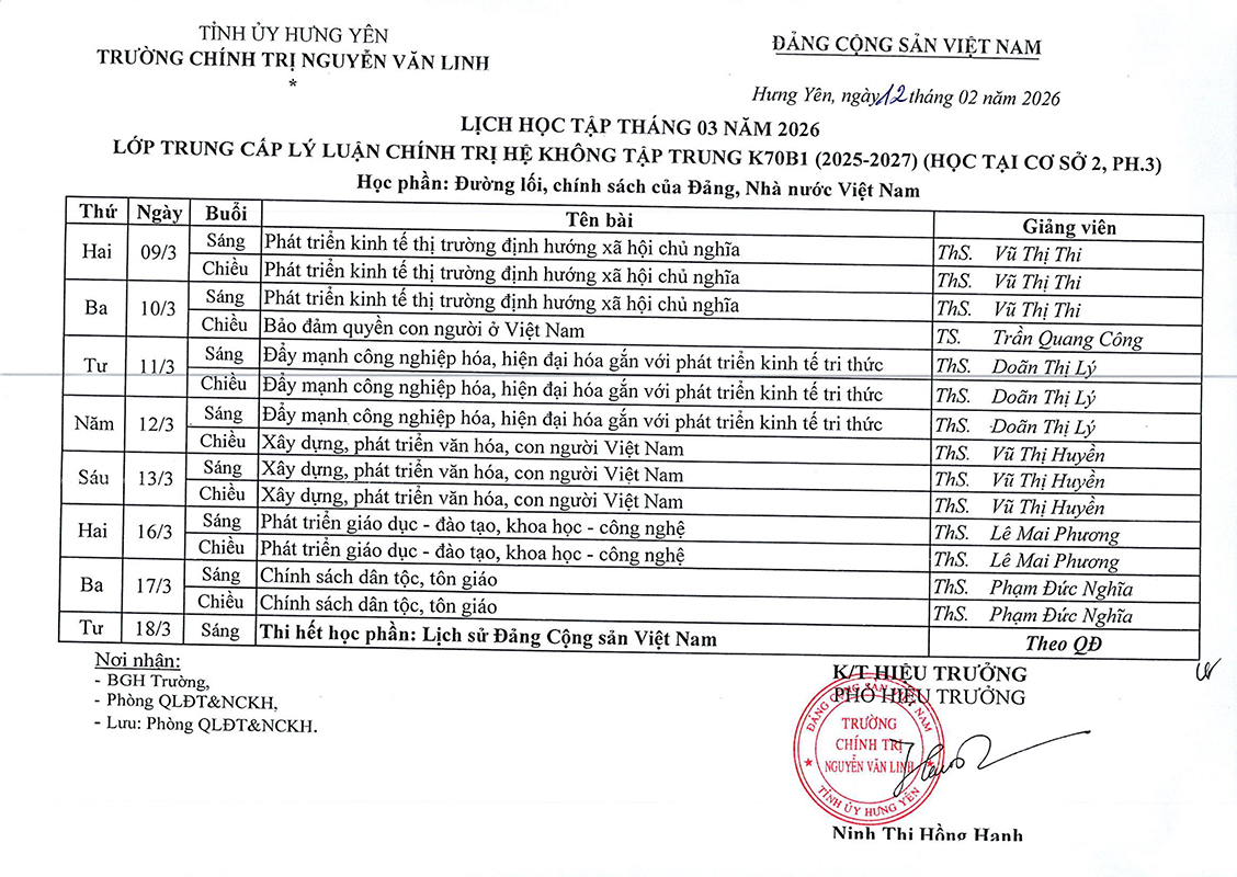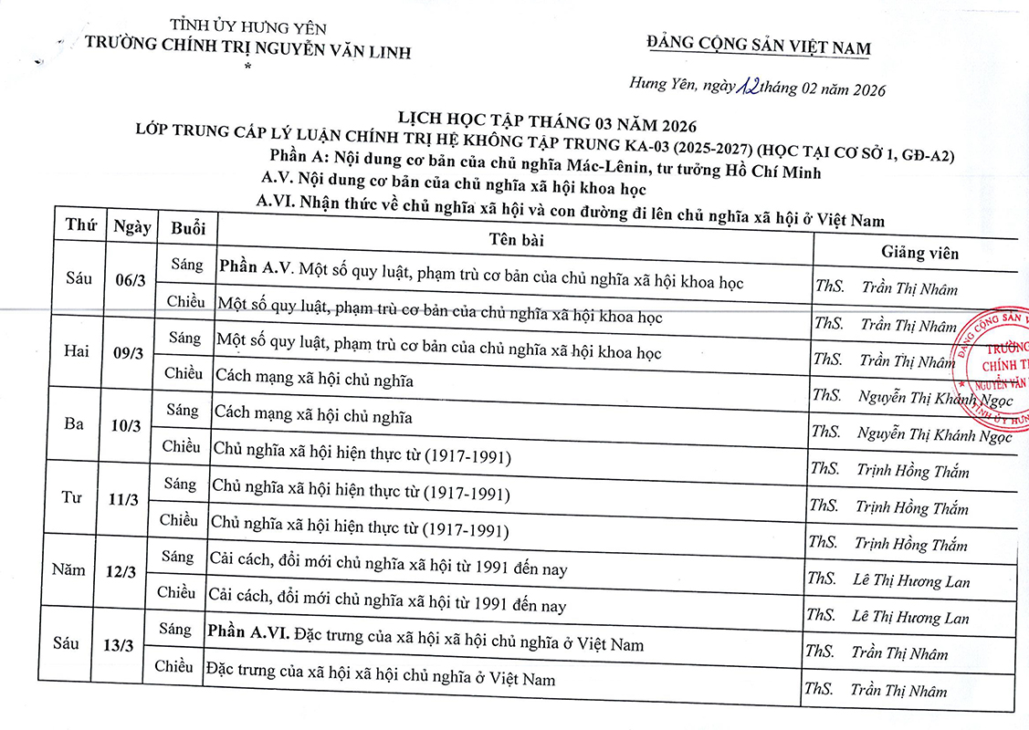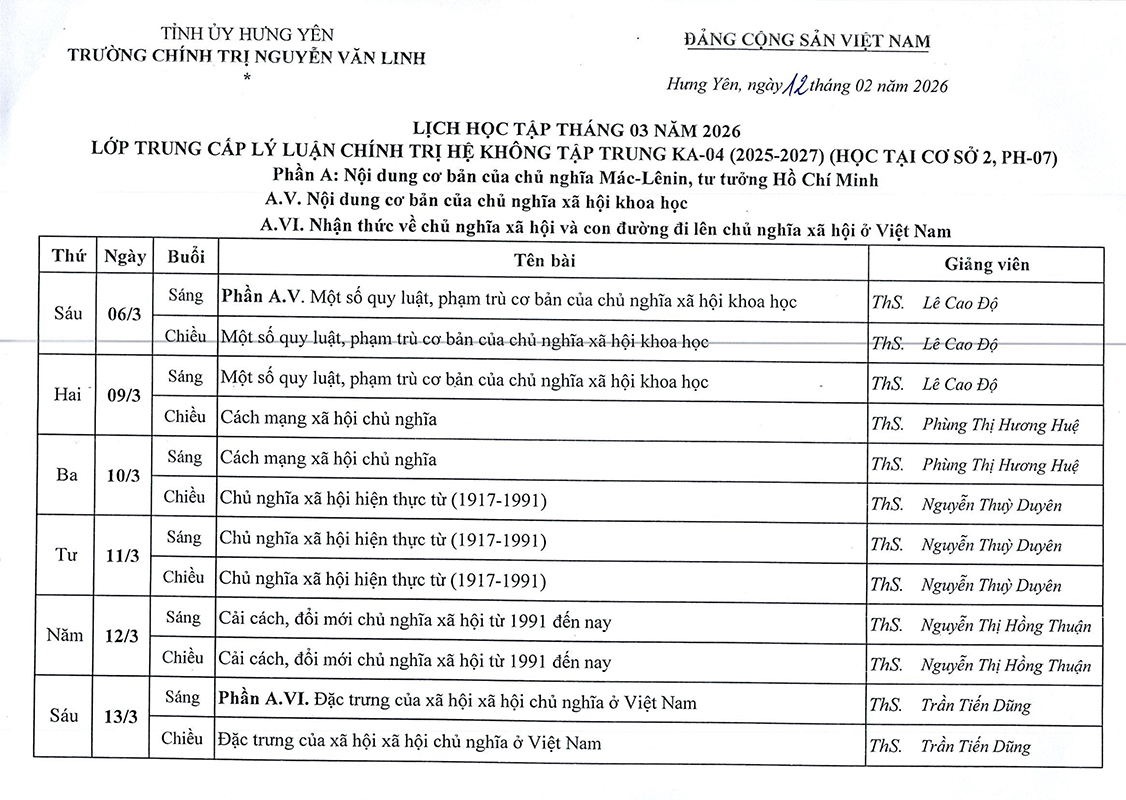 Lịch học tập tháng 3 năm 2026 các lớp TCLLCT
