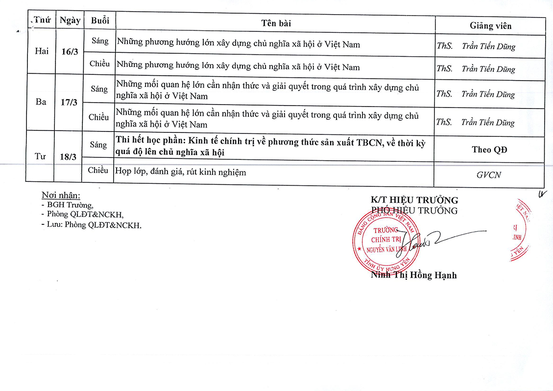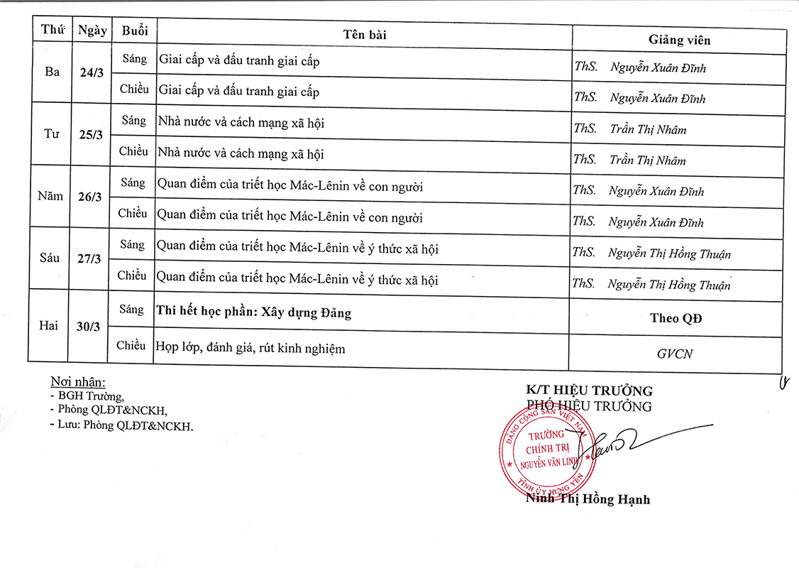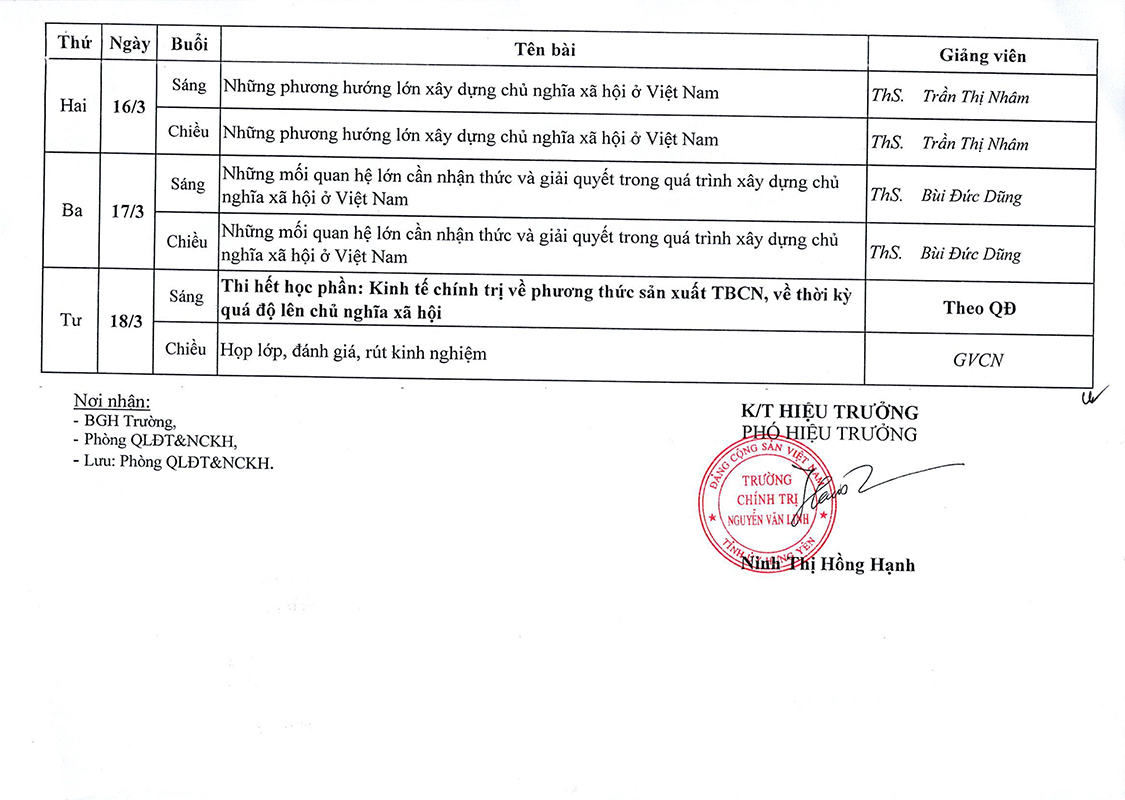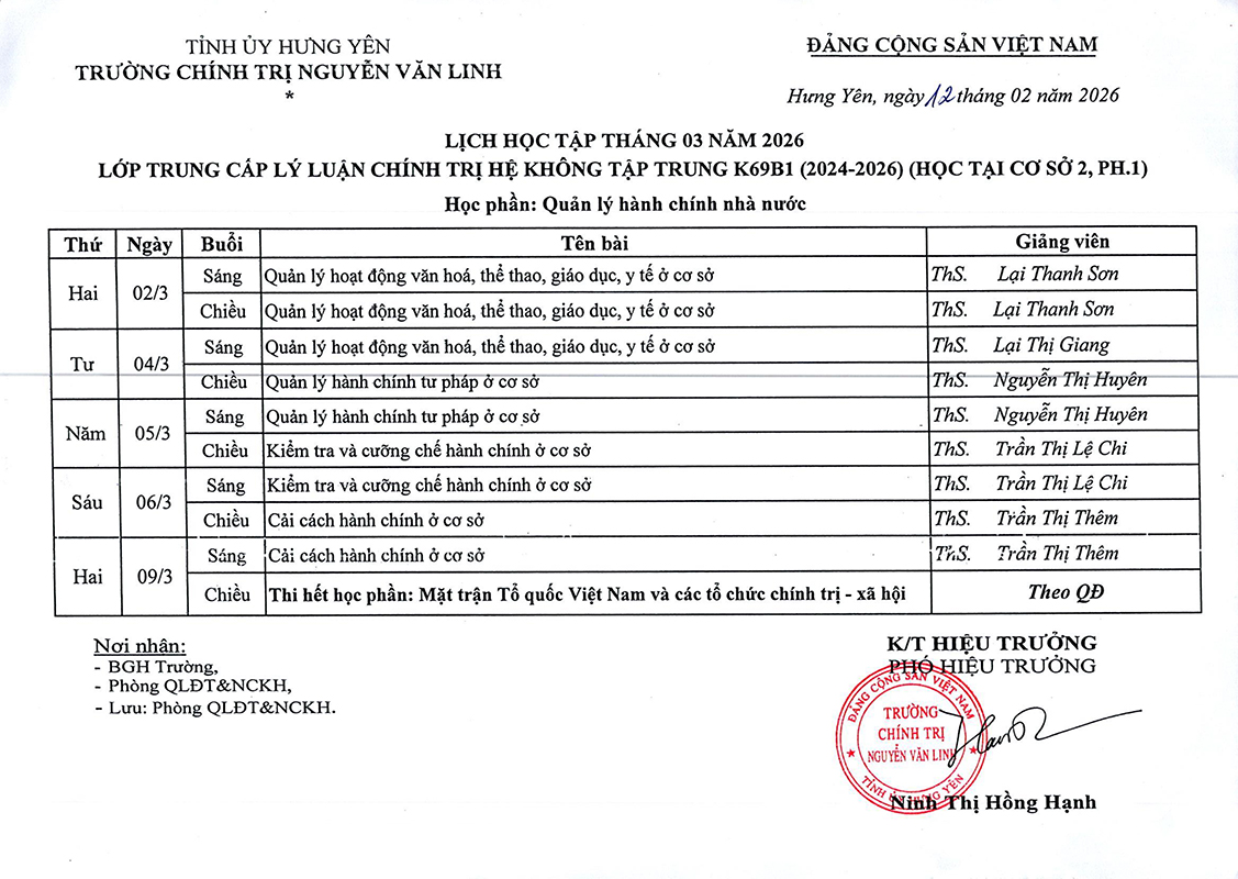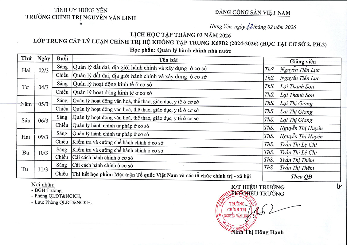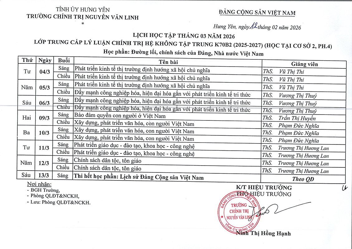 Lịch học tập tháng 3 năm 2026 các lớp TCLLCT