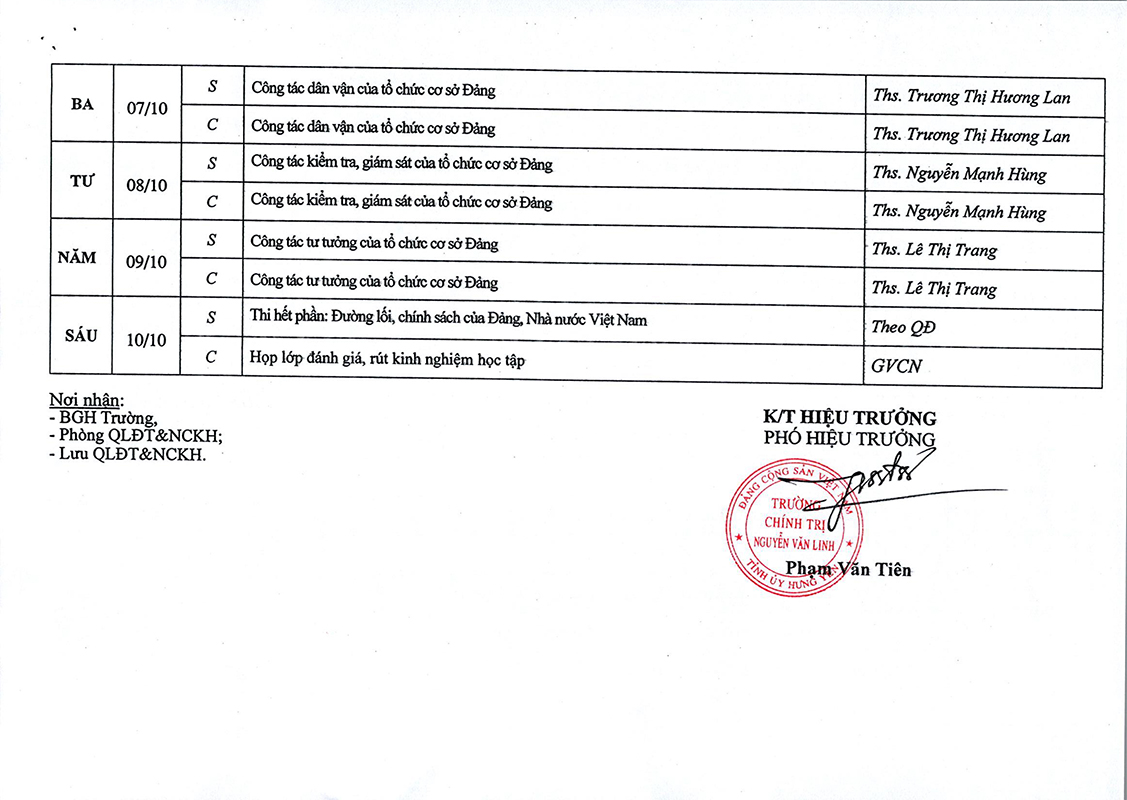Lịch học tập tháng 9 năm 2025 các lớp TCLLCT (Cơ sở 1)
