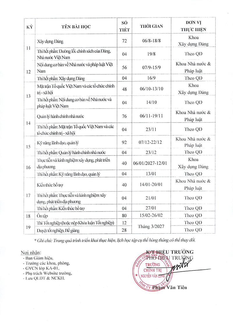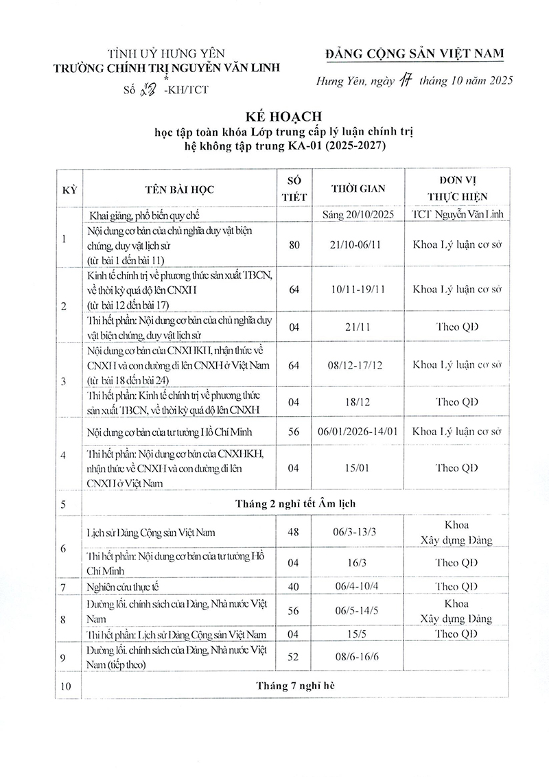 Lịch học tập toàn khóa lớp TCLLCT Hệ không tập trung KA-01 (2025-2027)